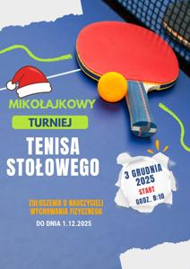 Nauczyciele wychowania fizycznego i dyrekcja szkoły zapraszają na Mikołajkowy Turniej Tenisa Stołowego. Szczegóły na plakacie.