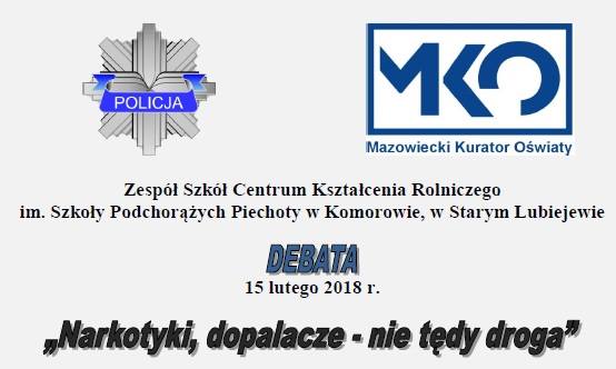 W czwartek, 15 lutego 2018 roku odbędzie się w naszej szkole debata„Narkotyki, dopalacze - nie tędy droga", organizowana przez Mazowieckie Kuratorium Oświaty w Warszawie, Komendę Wojewódzką Policji przy współudziale naszej szkoły.
