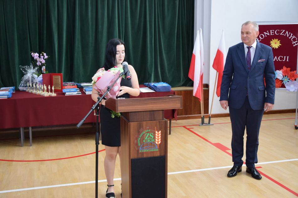 W imieniu młodzieży głos zabrała przewodnicząca Samorządu Uczniowskiego Wiktoria Ciurzycka, która składając kwiaty na ręce Pana Dyrektora podziękowała za codzienną troskę i współpracę z Samorządem Uczniowskimi i twórczą opiekę nad młodzieżą.