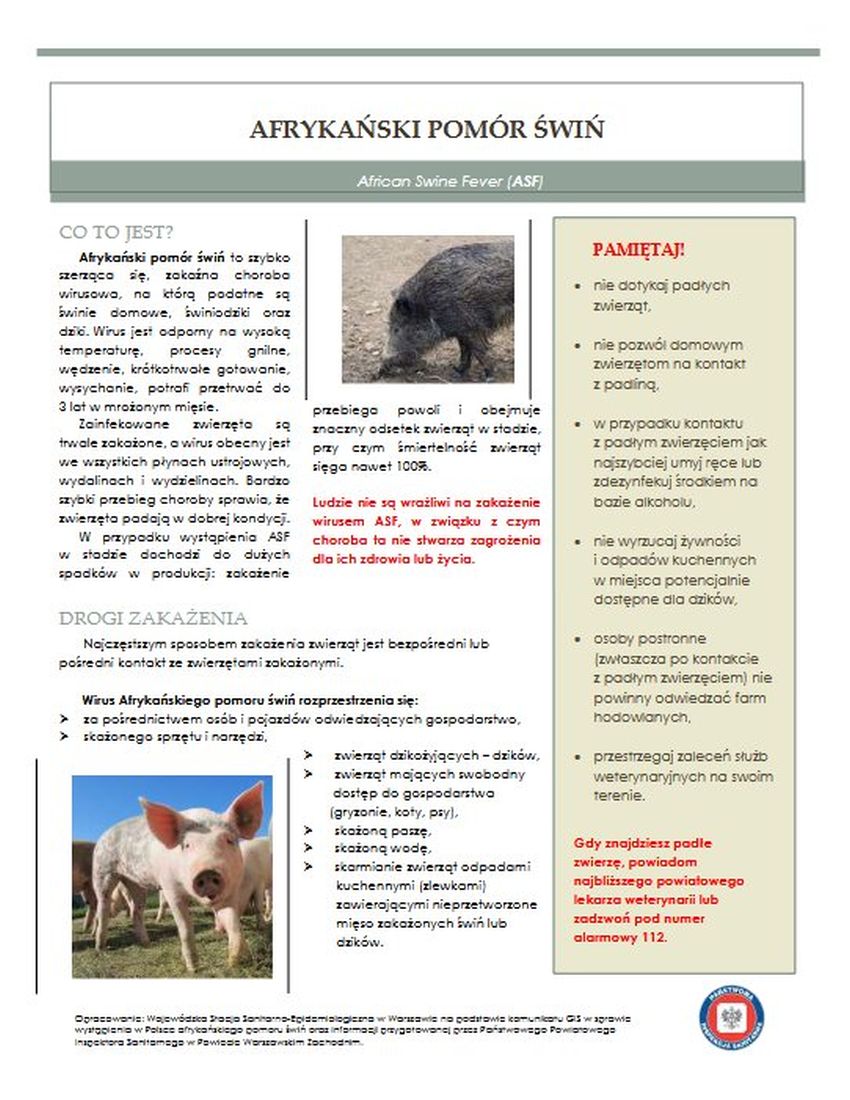 W związku z wykryciem w centralnej części województwa mazowieckiego kolejnych dzików zarażonych wirusem Afrykańskiego Pomoru Świń (ASF) przekazujemy informacje Powiatowej Stacji Sanitarno-Epidemiologicznej w Ostrowi Mazowieckiej.