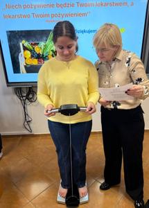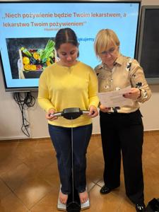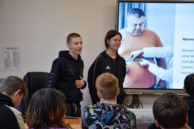 Nie zabrakło również części praktycznej, podczas której uczniowie zapoznali swoich młodszych kolegów z pojęciami BMI (Body Mass Index) oraz WHR (Waist-Hip Ratio), które służą do oceny proporcji i składu ciała. Następnie przeprowadzono analizę składu ciała przy użyciu profesjonalnego analizatora, dzięki czemu uczestnicy mogli zobaczyć, jak w praktyce wygląda badanie poziomu tkanki tłuszczowej, masy mięśniowej czy nawodnienia organizmu.