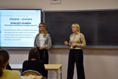 24 października włączyliśmy się w obchody Światowego Dnia Walki z Otyłością, by zwrócić uwagę na rosnący problem nadwagi i promować troskę o zdrowie poprzez właściwe odżywianie oraz regularny ruch. Uczniowie z klasy IV PT: Szymon Młynarczyk, Magda Wyszomierska oraz Alicja Trzaska przygotowali i przeprowadzili interesującą prelekcję na temat otyłości oraz metod jej zwalczania. Spotkanie było dedykowane młodszym koleżankom i kolegom z klas: I PTH, I BBA oraz II BBA.