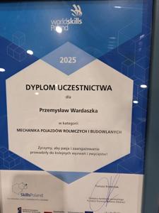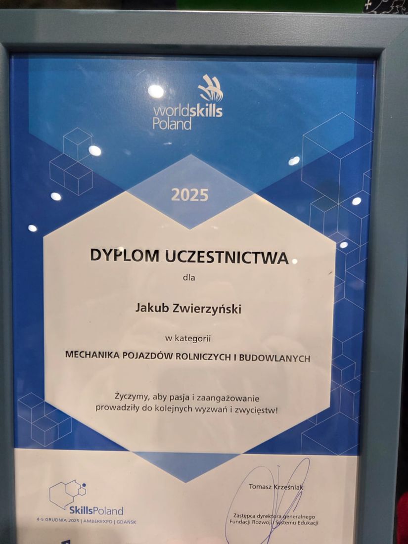 W dniach 3–5 grudnia 2025 roku dwaj uczniowie naszej szkoły – Jakub Zwierzyński z klasy IVBTb i Przemysław Wardaszka z klasy VBT, kształcący się w zawodzie technik mechanizacji rolnictwa i agrotroniki, reprezentowali naszą szkołę w prestiżowym konkursie SkillsPoland 2025. Znaleźli się w grupie dwunastu osób wyłonionych we wcześniejszych etapach, spośród zawodników z całej Polski, co jest nie lada wyczynem. Skills Poland to ogólnopolski konkurs umiejętności zawodowych dedykowany uczniom, studentom i młodym ludziom rozpoczynającym pracę. Jest częścią inicjatyw WorldSkills i EuroSkills – światowych konkursów branżowych zachęcających młodych ludzi do podnoszenia swoich umiejętności zawodowych Wydarzenie odbywało się w Gdańskim Centrum Wystawienniczo - Kongresowym AMBEREXPO, a nasi uczniowie rywalizowali w niezwykle wymagającej konkurencji mechaniki pojazdów rolniczych i budowlanych.