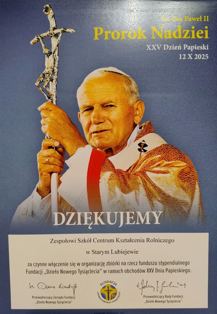 Nasza szkoła otrzymała od Fundacji "Dzieło Nowego Tysiąclecia" podziękowania za włączenie się w organizację zbiórki na rzecz funduszu stypendialnego.