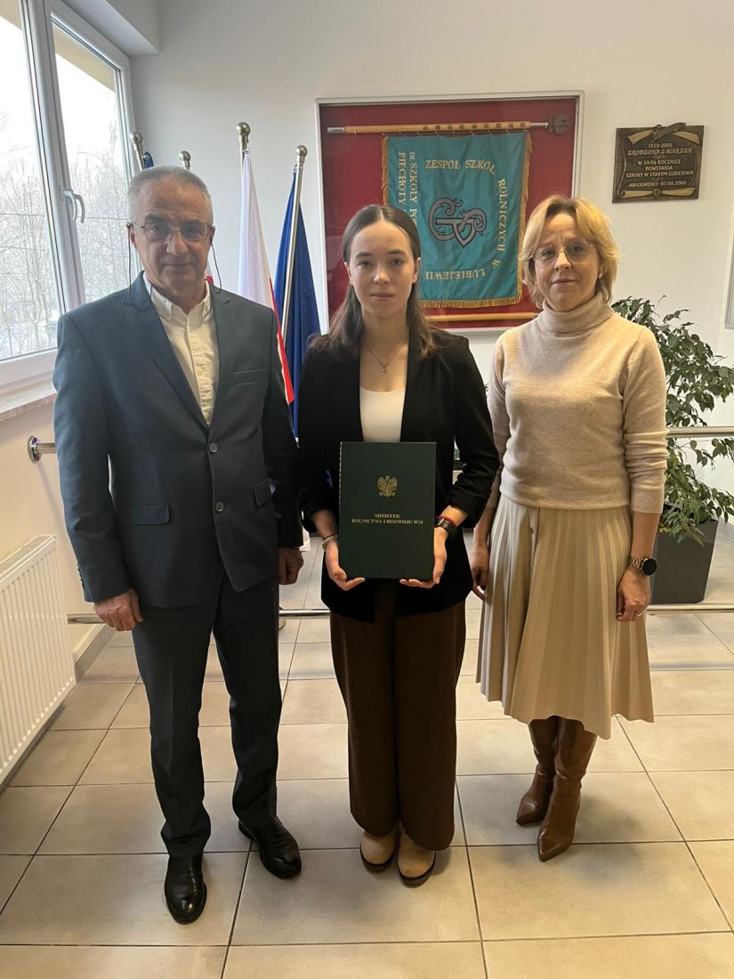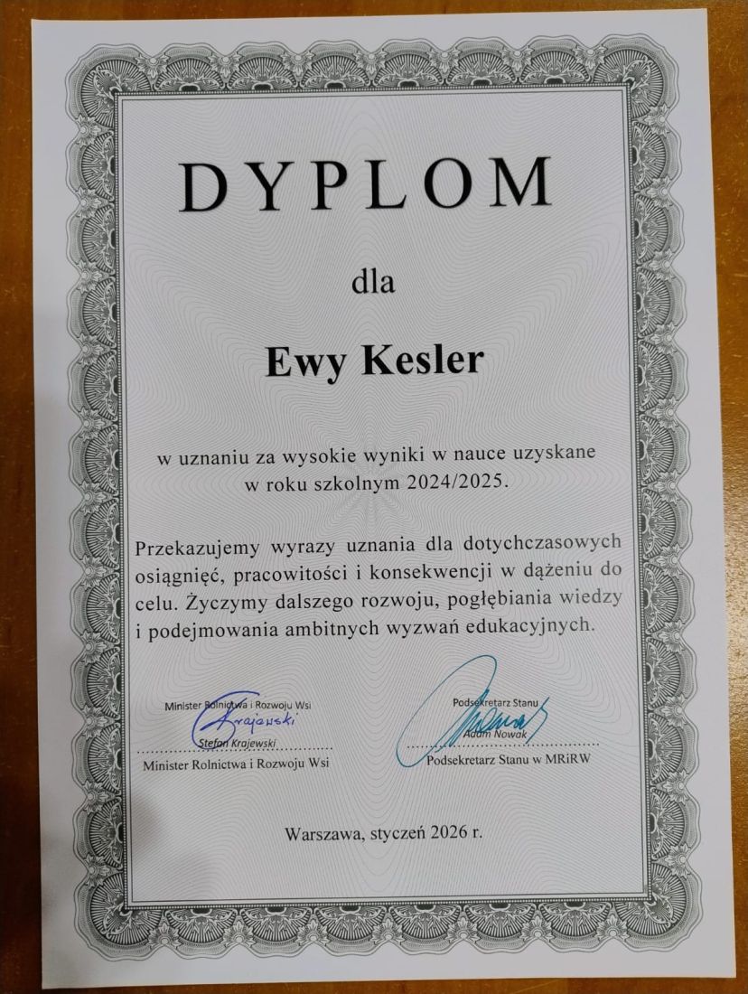 W Ministerstwie Rolnictwa i Rozwoju Wsi uhonorowano najlepszych uczniów szkół rolniczych wchodzących w skład Sieci Szkół Rolniczych MRiRW. Wśród wyróżnionych znalazło się 95 uczniów z całej Polski – w tym dwoje reprezentantów naszej szkoły: