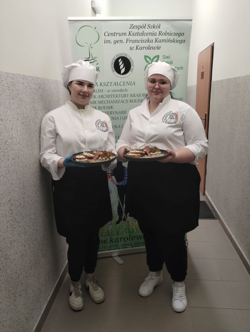 Wydarzenie odbyło się pod honorowym patronatem Ministerstwa Rolnictwa i Rozwoju Wsi, co dodatkowo podkreśliło rangę i wartość konkursu. Nasze reprezentantki przygotowały placki ziemniaczane z farszem i chrupiącymi skwarkami z obierek, zachwycając jury nie tylko smakiem, ale też pomysłowym wykorzystaniem składników, które często trafiają do kosza. Ich danie zostało docenione za oryginalność i zgodność z ideą „zero waste”. Nasze uczennice, po raz kolejny, udowodniły, że pasja, kreatywność i szacunek do tradycji mogą iść w parze z nowoczesnym podejściem do gotowania. Anastazję Lewandowską i Maję Małecką przygotowywała do konkursu pani Sylwia Świderska. Opiekę merytoryczną i praktyczną podczas konkursu w Karolewie nad uczestniczkami sprawowała pani Iwona Jastrzębska.
